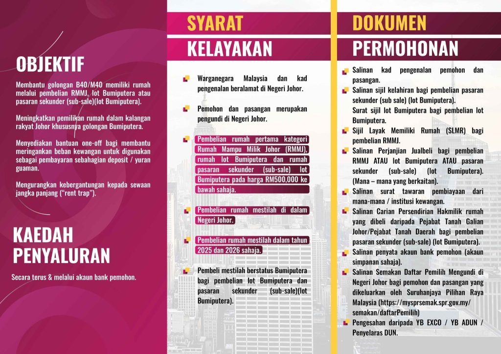 Program ini memberikan bantuan kepada lebih 20,000 pembeli rumah pertama yang membeli rumah di bawah kategori Rumah Mampu Milik Johor (RMMJ sama ada lot Bumiputera atau rumah pasaran sekunder (sub-sale) bagi lot Bumiputera. Setiap penerima yang layak akan menerima bayaran secara one-off sebanyak RM5,000.
