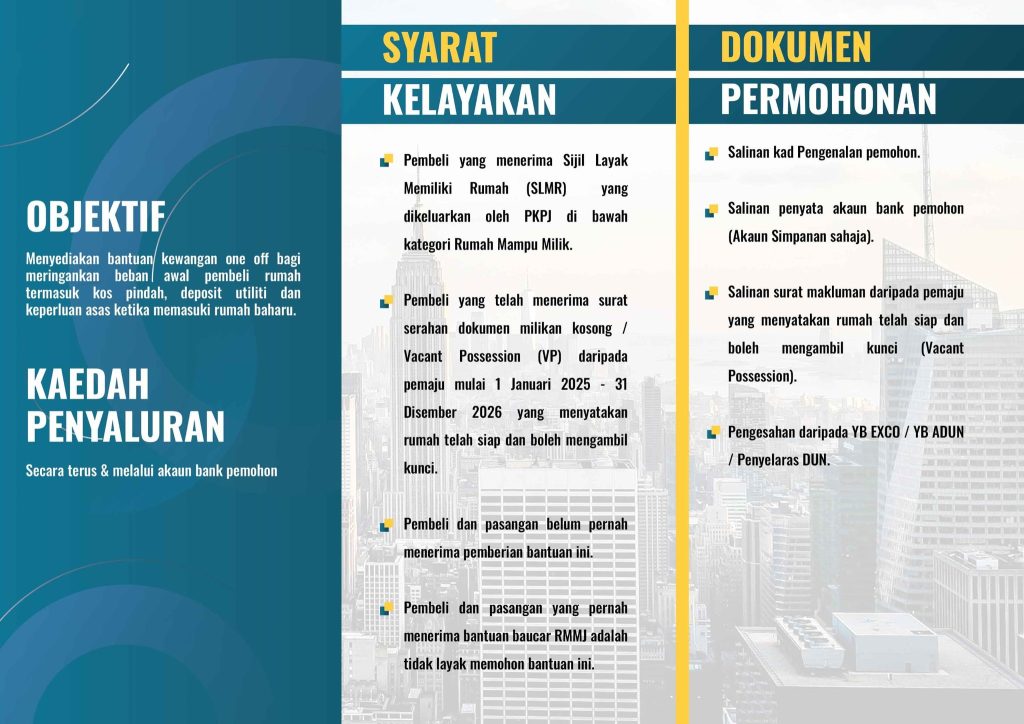 Bantuan ini merupakan bayaran secara “one-off” kepada penerima yang layak untuk meringankan beban awal pembeli rumah, termasuk kos perpindahan, deposit utiliti, serta keperluan asas ketika memasuki rumah baharu. Pada awalnya bantuan ini diberikan sebanyak RM1,000.00 tetapi ianya telah dinaikkan kepada RM2,000.00 bermula tahun 2026 ini.