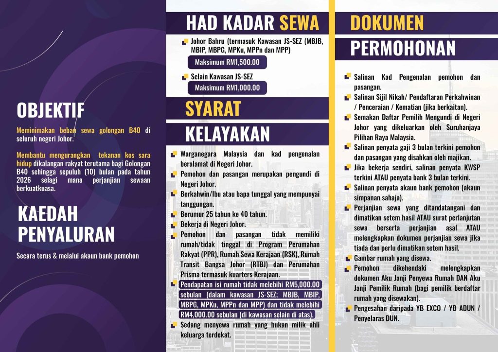 Program Bantuan Sewa Rumah ini adalah bertujuan meminimakan beban sewa golongan b40 di seluruh negeri Johor serta membantu mengurangkan tekanan kos sara hidup dalam kalangan rakyat terutama golongan b40 selama 10 bulan Bermula Mac 2026 dan akan berterusan sepanjang Tahun 2026 mengikut perjanjian sewaan yang berkuatkuasa.