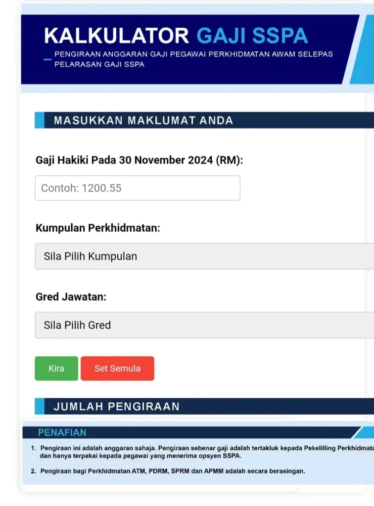 Akses Kalkulator Gaji SSPA di sini: https://sspa.jpa.gov.my/kiraan/kalkulator.php