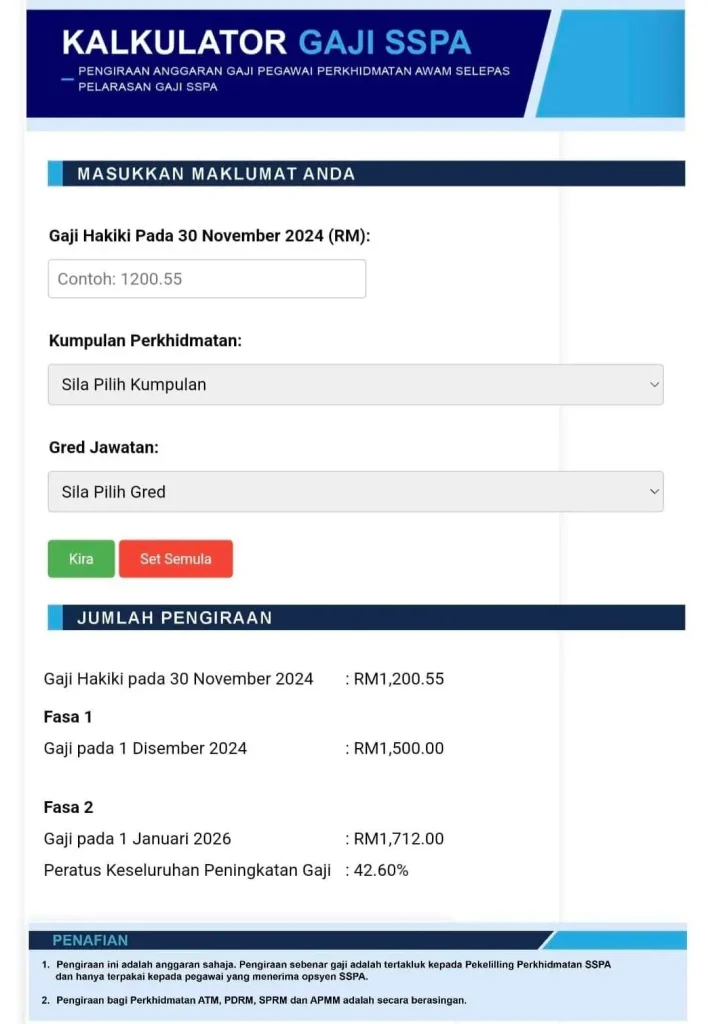 Kalkulator ini membolehkan penjawat awam mengetahui anggaran gaji baharu selepas pelarasan, termasuk kesan kenaikan Fasa 1 dan Fasa 2.